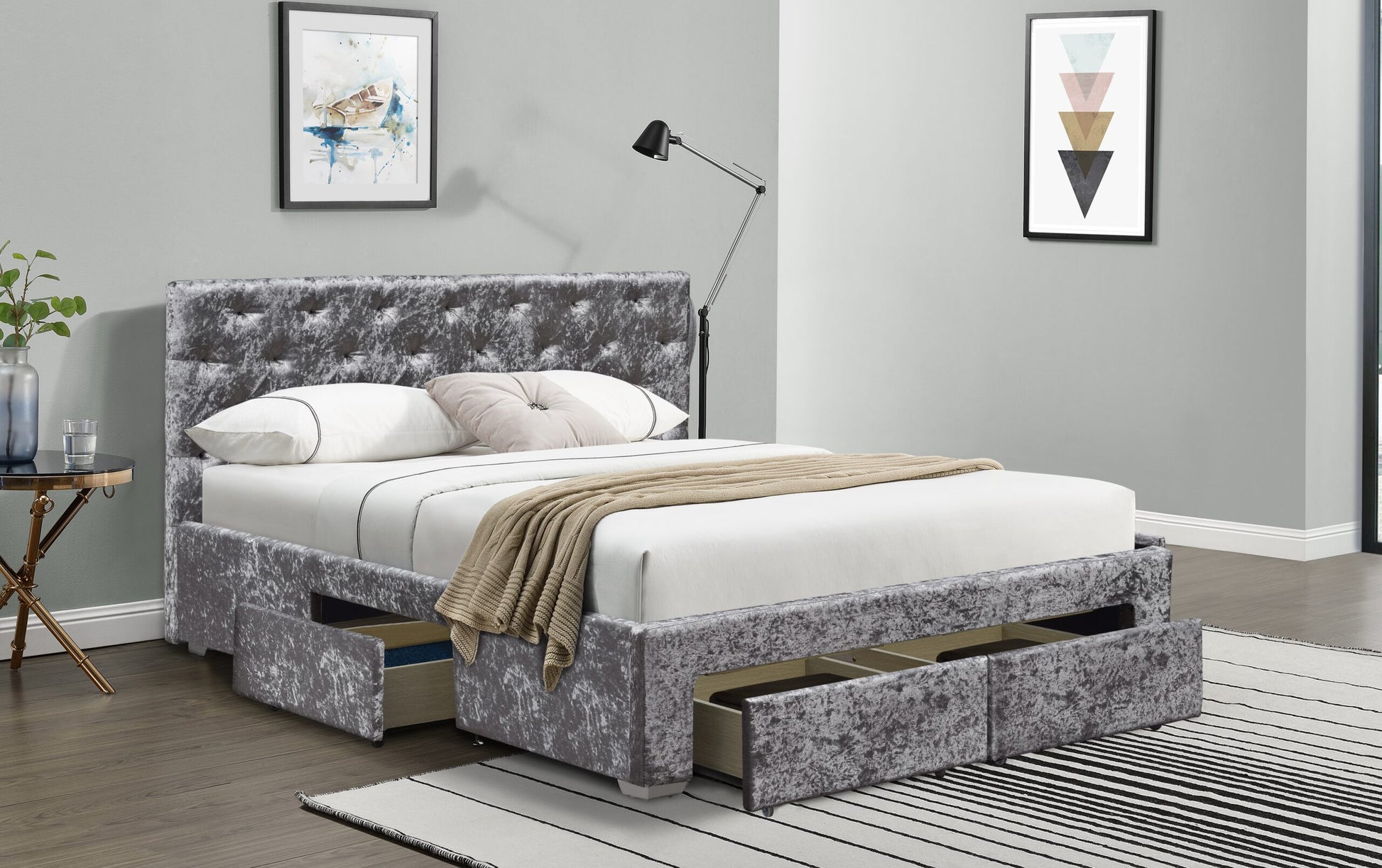 Werten Sie Ihr Schlafzimmer mit dem luxuriösen Bettgestell Columbo Crushed Velvet mit 4 Schubladen auf. Der silberne Pannesamtstoff verleiht einen Hauch von Eleganz, während das tief gepolsterte, geknöpfte Kopfteil Komfort bietet. Mit einem soliden Holzrahmen und einem gefederten Lattenrost bietet es volle Matratzenunterstützung für eine erholsame Nachtruhe. Außerdem helfen die 4 Schubladen dabei, Ihren Raum aufgeräumt zu halten. In 2 Größen erhältlich. Werten Sie Ihr Schlafzimmer mit den Premium-Funktionen des Bettgestells Columbo Crushed Velvet mit 4 Schubladen auf. Der silberne Pannesamtstoff strahlt Eleganz und Raffinesse aus, während das tief gepolsterte, geknöpfte Kopfteil unschlagbaren Komfort bietet. Mit einem soliden Holzrahmen und einem gefederten Lattenrost bietet es volle Matratzenunterstützung für eine erholsame Nachtruhe. Und mit 4 geräumigen Schubladen können Sie sich endlich von Unordnung in Ihrem persönlichen Refugium verabschieden. Wählen Sie aus 2 Größen, die Ihren Bedürfnissen entsprechen und Ihr Schlaferlebnis verbessern.